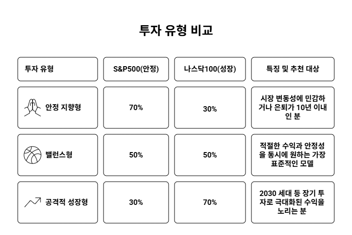 | 투자 유형 | S&P500(안정) | 나스닥100(성장) | 특징 및 추천 대상 |