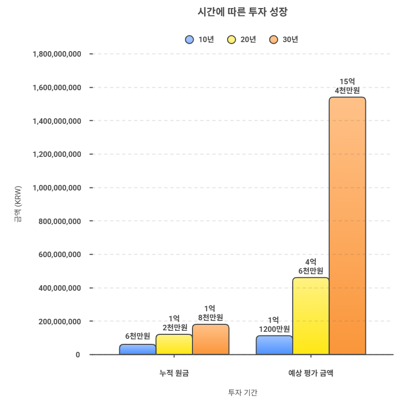 | 20년 뒤 | 1억 4,400만원 | 약 5억 9,350만원 | 원금의 약 4.1배 도달 |